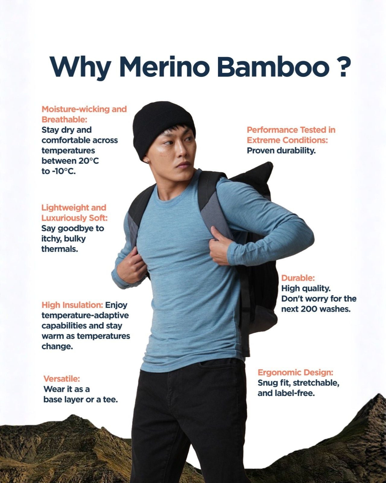 Soft for your skin. Light as a Feather. Made of Merino Wool and Bamboo Wool. 100% Warmth with temperature-regulating properties. Fitted for your workouts and fun. Slip into Merino Wool Thermals. Explore adventures for the explorer in you.