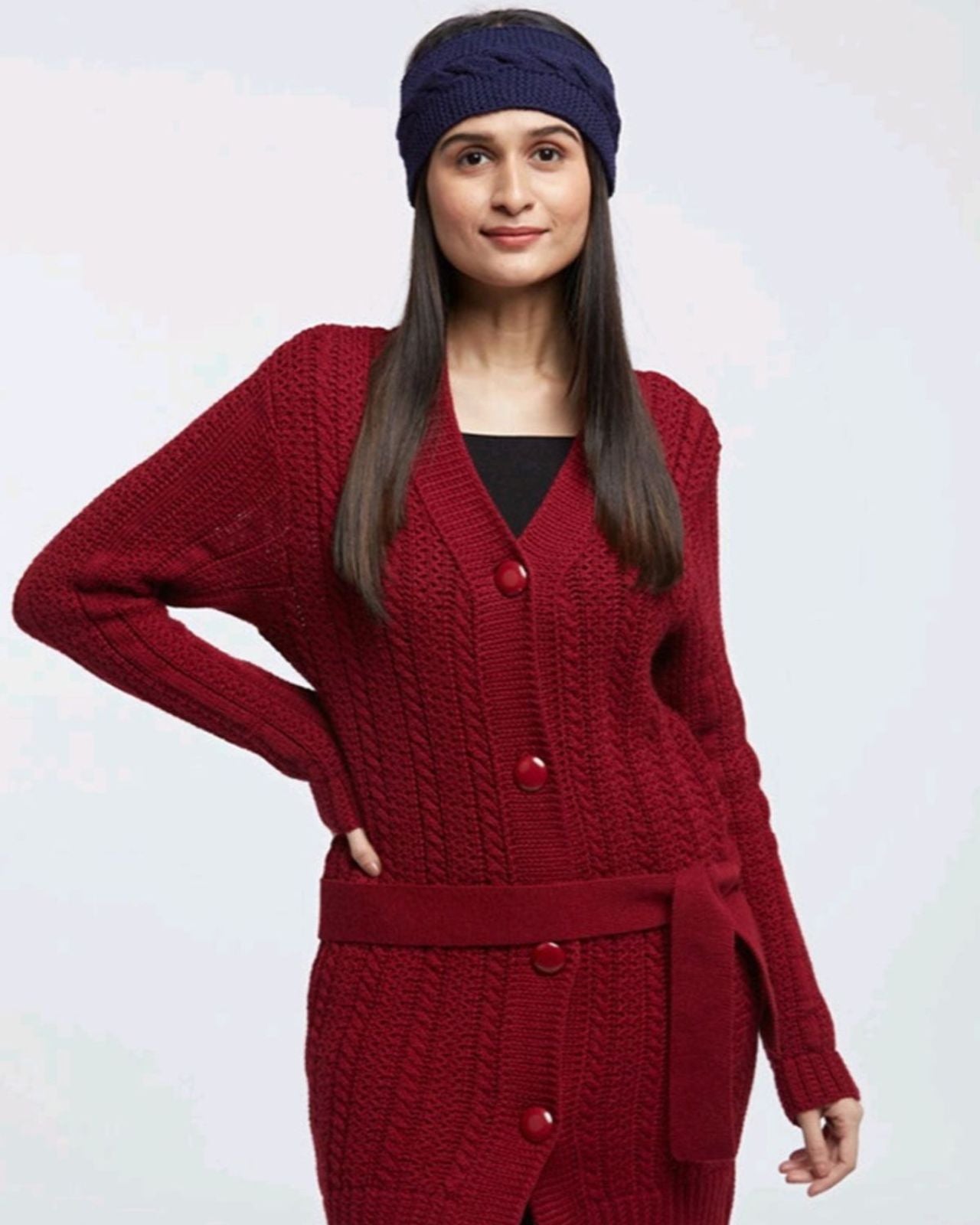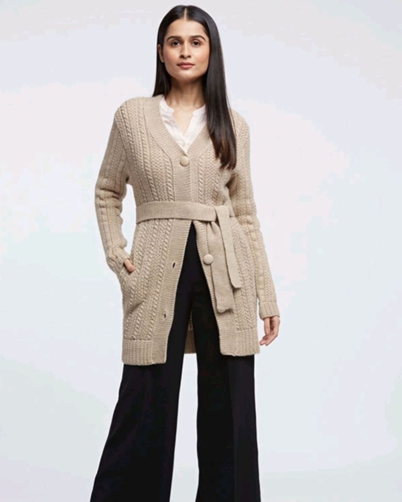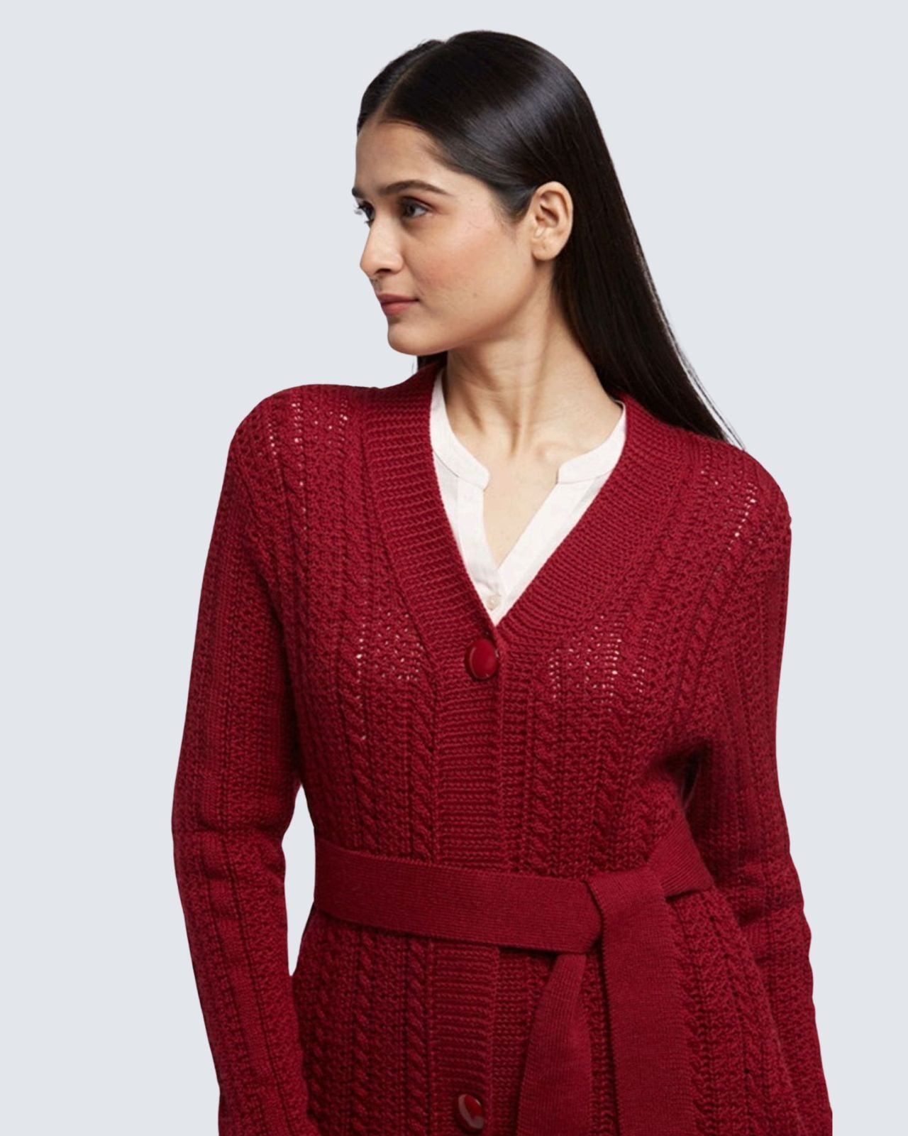 Wrap yourself in elegance with our Women's Merino Wool Long Cardigan. Made of 100% merino wool, this full-sleeved cardigan is perfect for cozy days. The traditional design features round buttons and a plain knit pattern with soft ribs. Wear it with the belt secured for a professional look, or style it casually over a pair of denim and a t-shirt. Versatile and chic, it's great for professional meetings or cozy evenings.