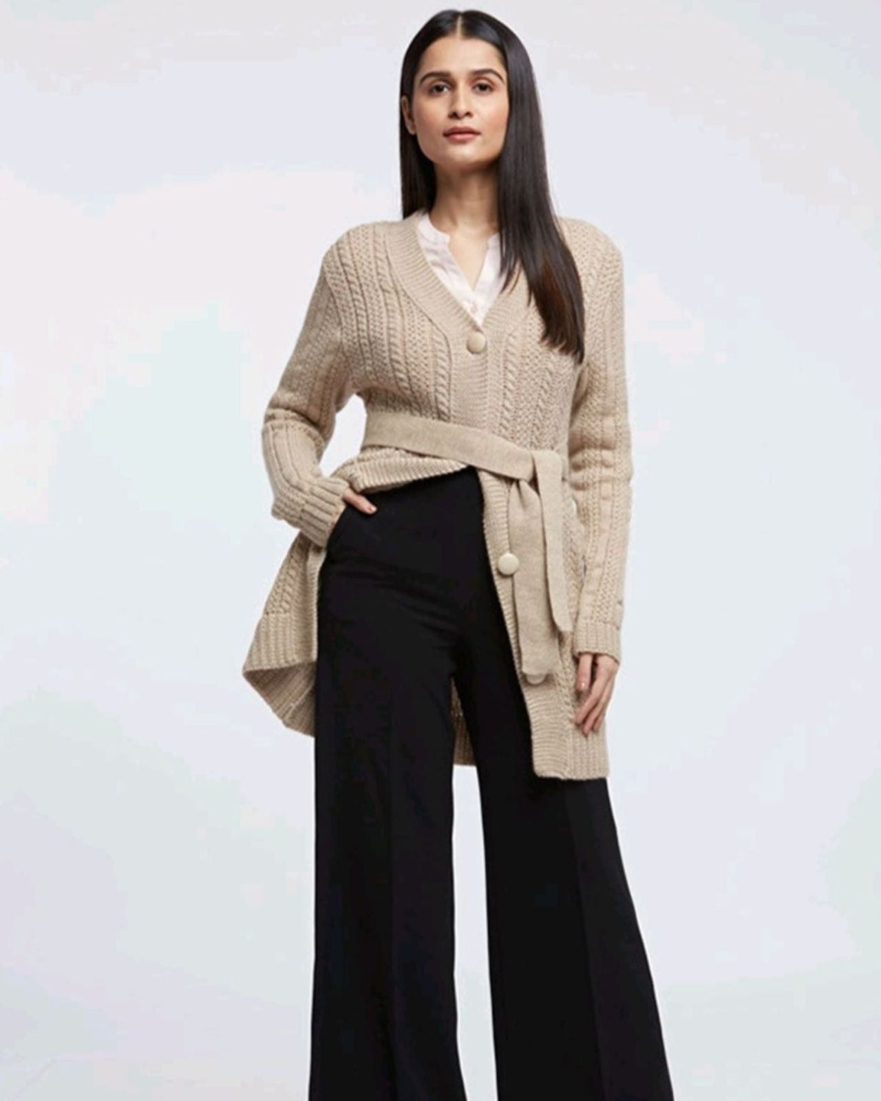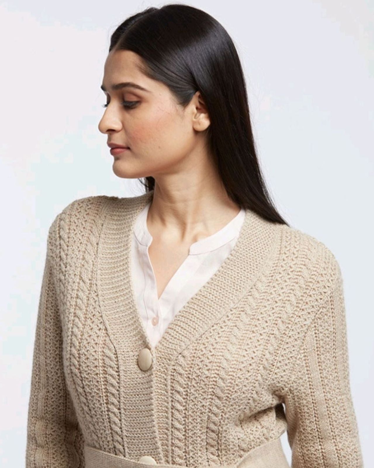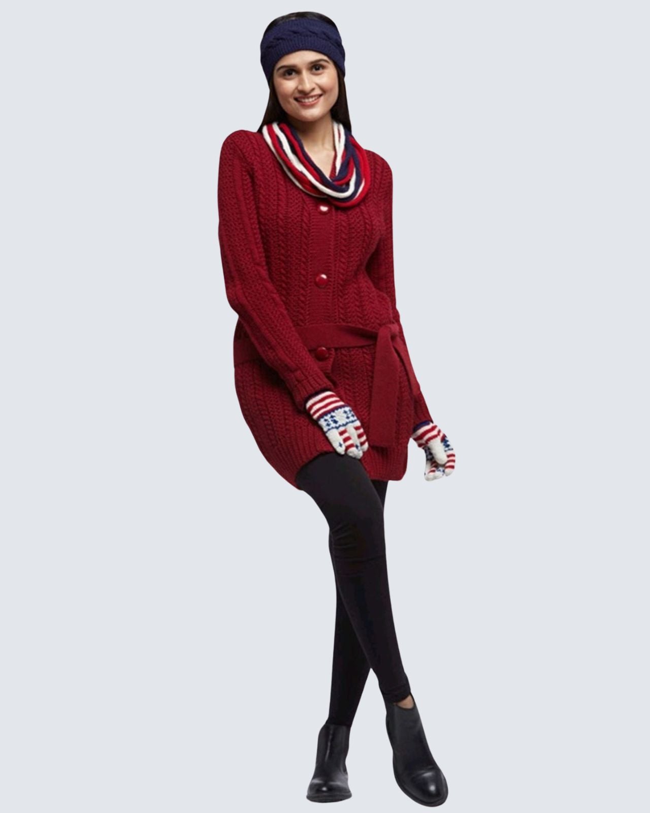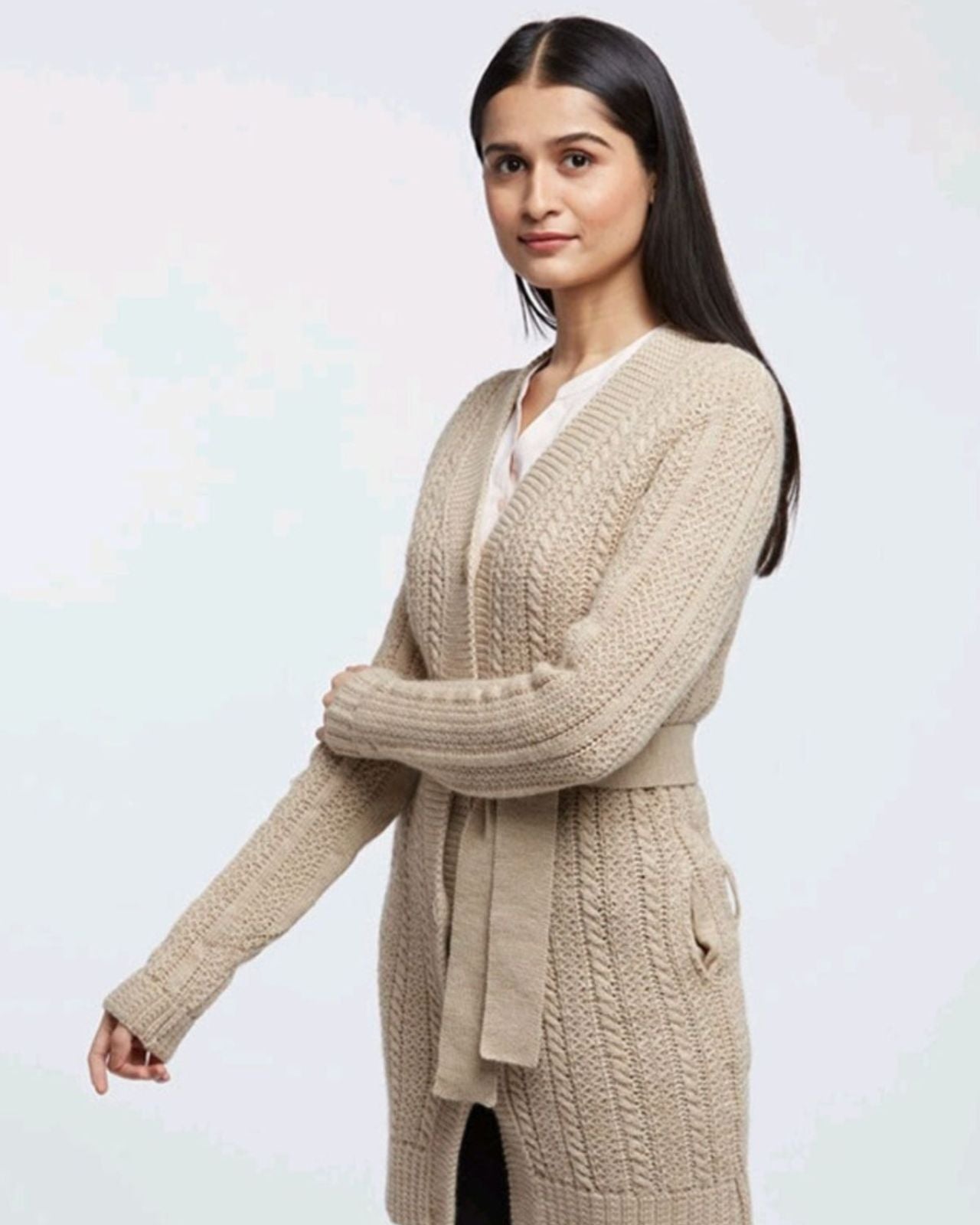 Wrap yourself in elegance with our Women's Merino Wool Long Cardigan. Made of 100% merino wool, this full-sleeved cardigan is perfect for cozy days. The traditional design features round buttons and a plain knit pattern with soft ribs. Wear it with the belt secured for a professional look, or style it casually over a pair of denim and a t-shirt. Versatile and chic, it's great for professional meetings or cozy evenings.