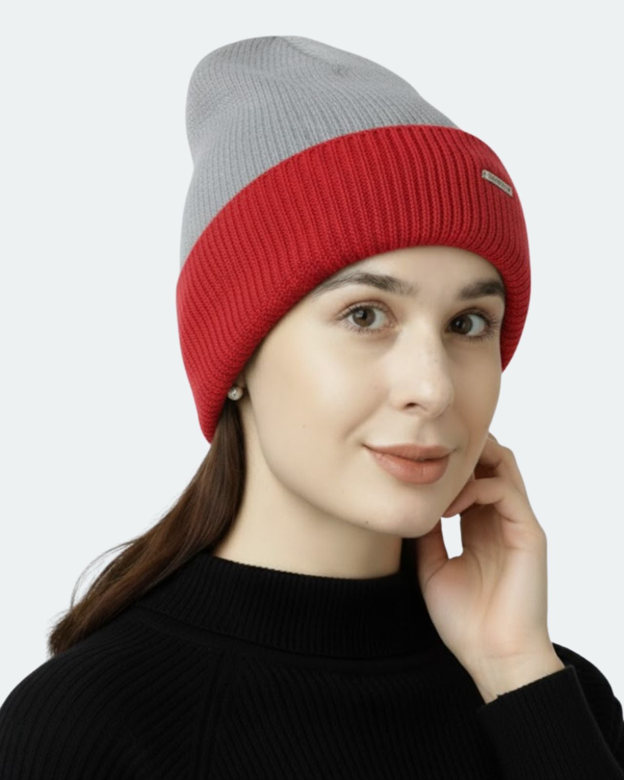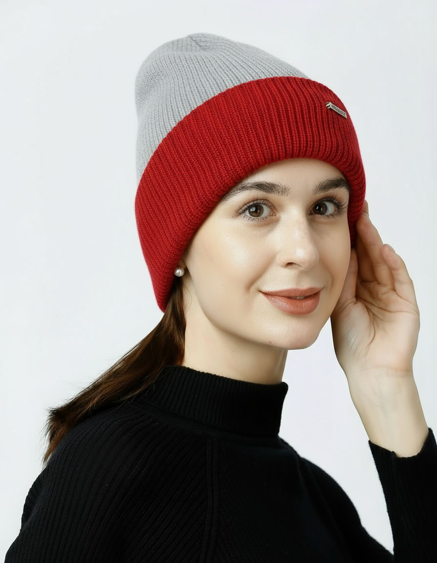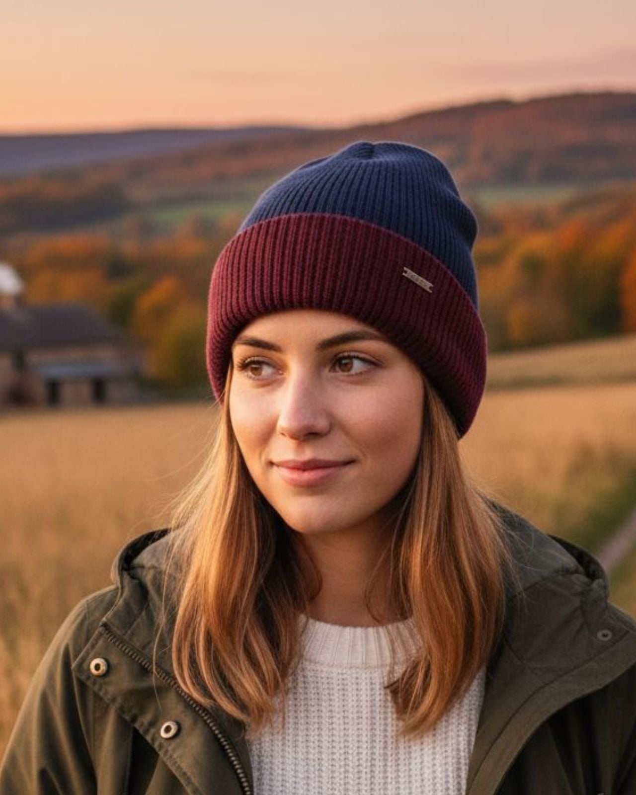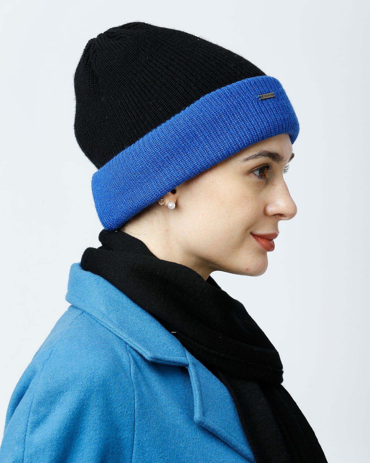 Soft, Stylish & Double Layered wool beanie. It’s a women’s merino wool reversible beanie that’s adjustable in length. It has a stylish metal applique/tag at the side. This double-layer merino beanie for women is not only a warm yet breathable reversible beanie but also an incredibly travel-friendly reversible beanie. Now look stylish by pairing it with Kosha’s Black Solid Puffer Jacket along with denim. With its two-tone design, it's the perfect stylish two-tone merino beanie for women to complement any outfit while keeping you cozy.