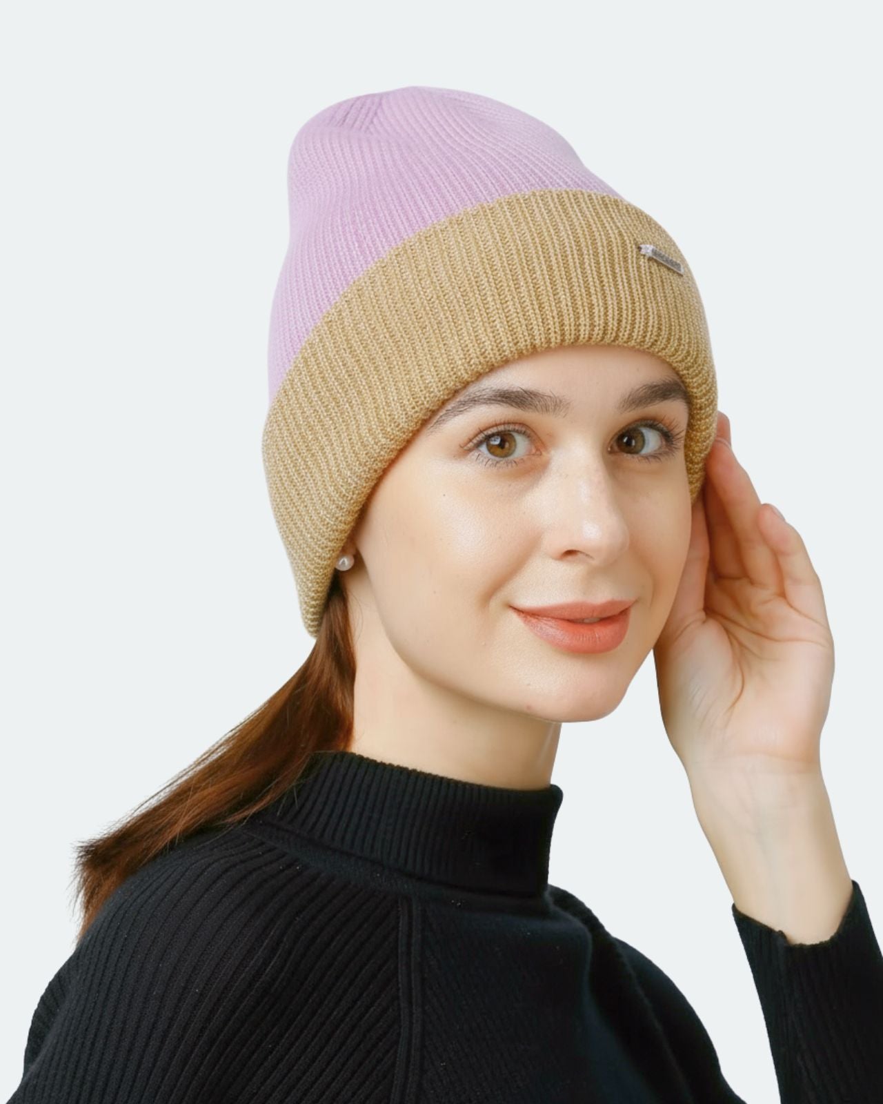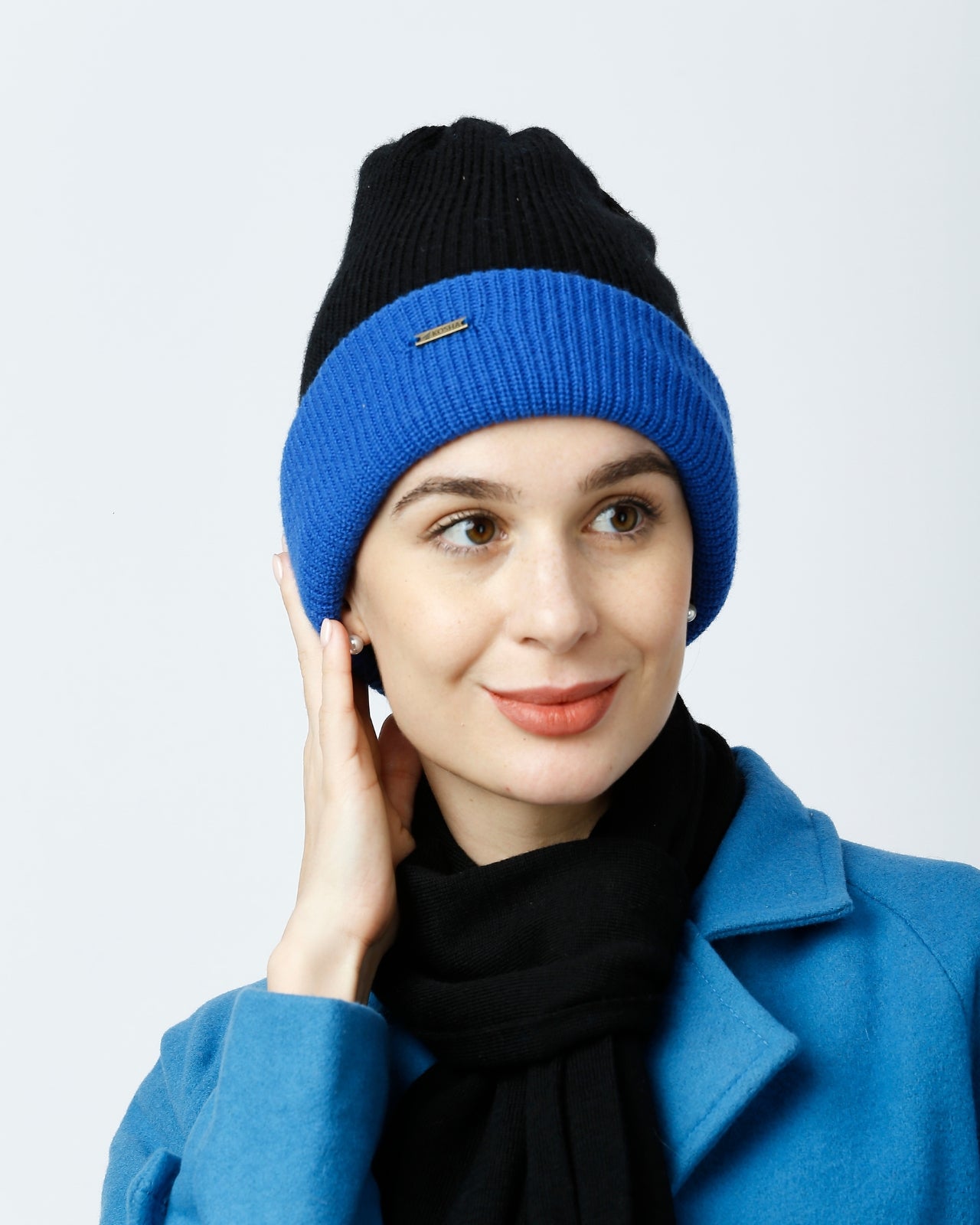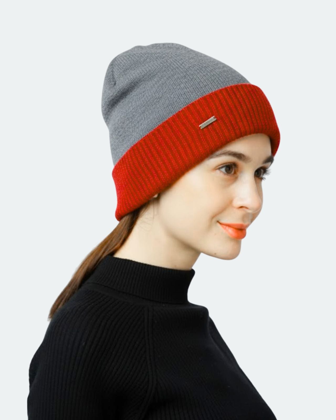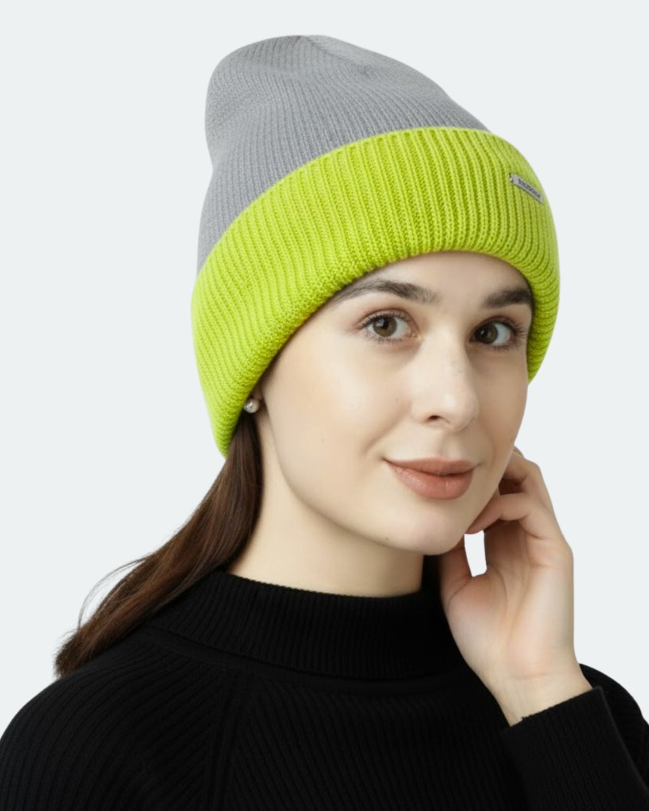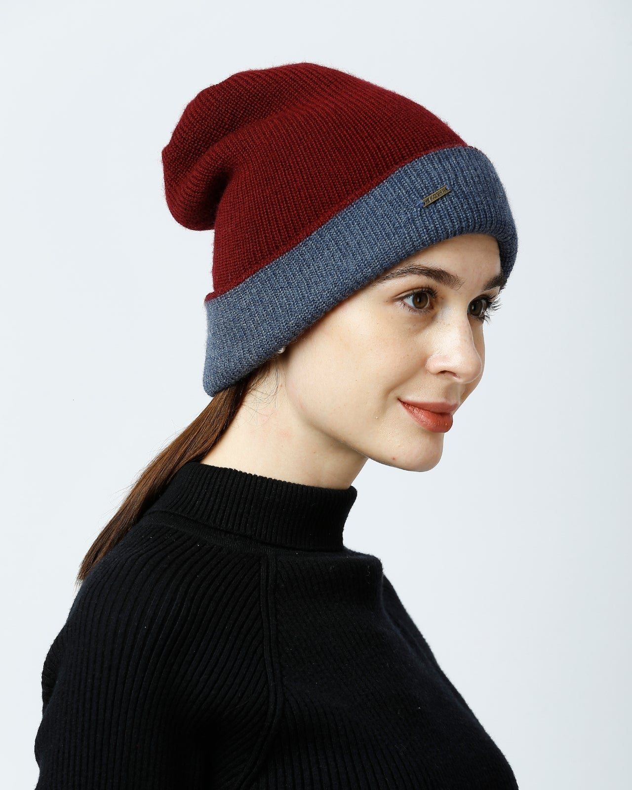 Soft, Stylish & Double Layered wool beanie. It’s a women’s merino wool reversible beanie that’s adjustable in length. It has a stylish metal applique/tag at the side. This double-layer merino beanie for women is not only a warm yet breathable reversible beanie but also an incredibly travel-friendly reversible beanie. Now look stylish by pairing it with Kosha’s Black Solid Puffer Jacket along with denim. With its two-tone design, it's the perfect stylish two-tone merino beanie for women to complement any outfit while keeping you cozy.