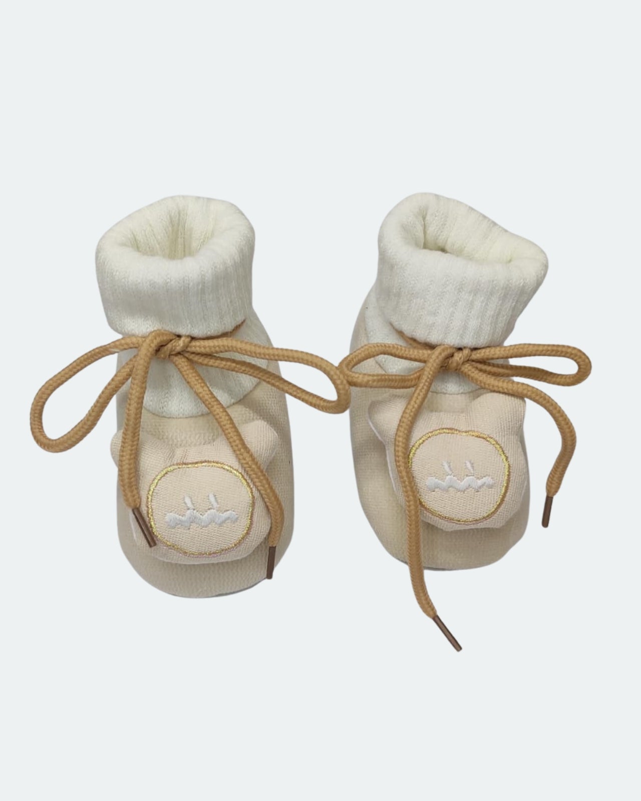 Keep your little one's feet cozy and stylish with these adorable soft woolen infant booties. Designed with comfort and warmth in mind, these booties feature a gentle ribbed cuff, lace-up front for a secure fit, and a soft sole perfect for delicate feet. The neutral beige and white color combination makes them perfect for any outfit. Ideal for newborns and infants.