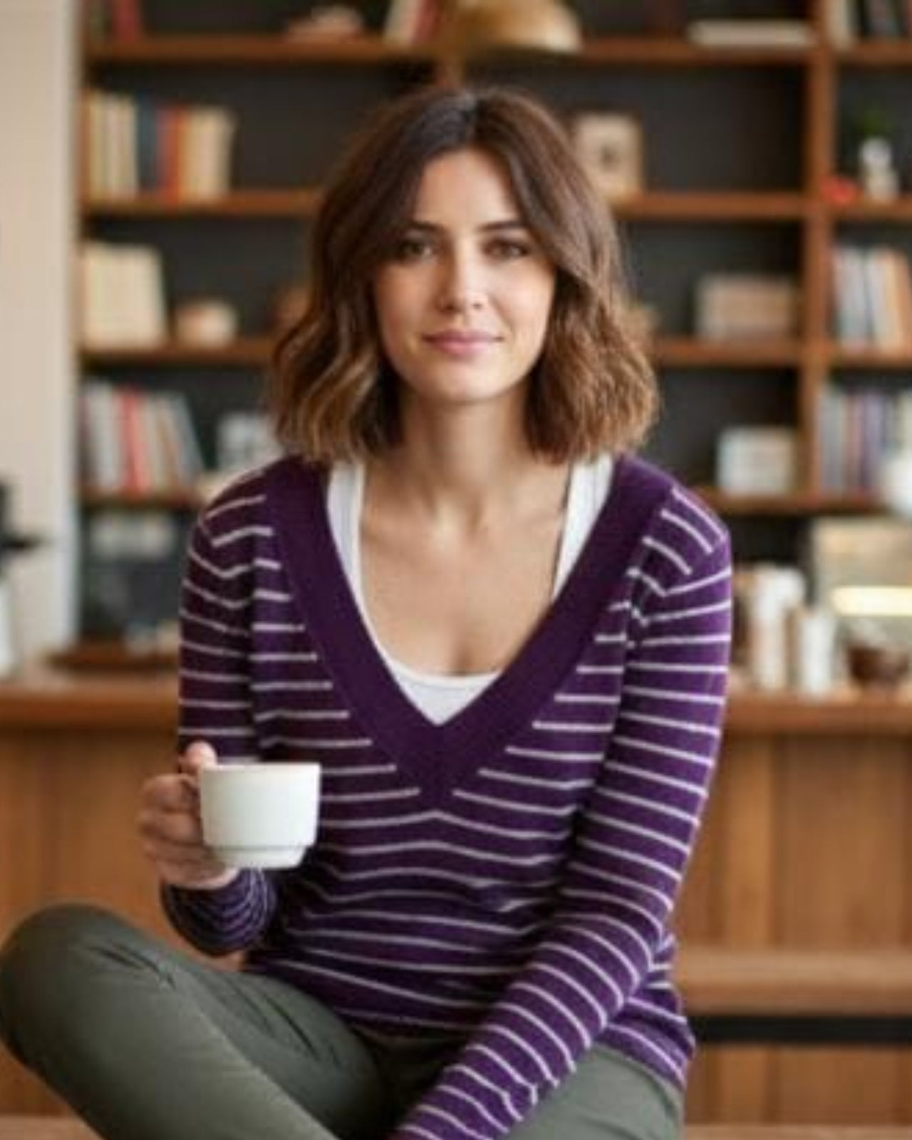 Whether you are grabbing a latte in a foggy hill station or heading to a winter brunch, this Purple stripe sweater adds a touch of brightness to the season. It captures the vibrant energy of a winter weekend in Shimla. This winter top is thin enough to layer comfortably under a denim jacket or puffer vest.
