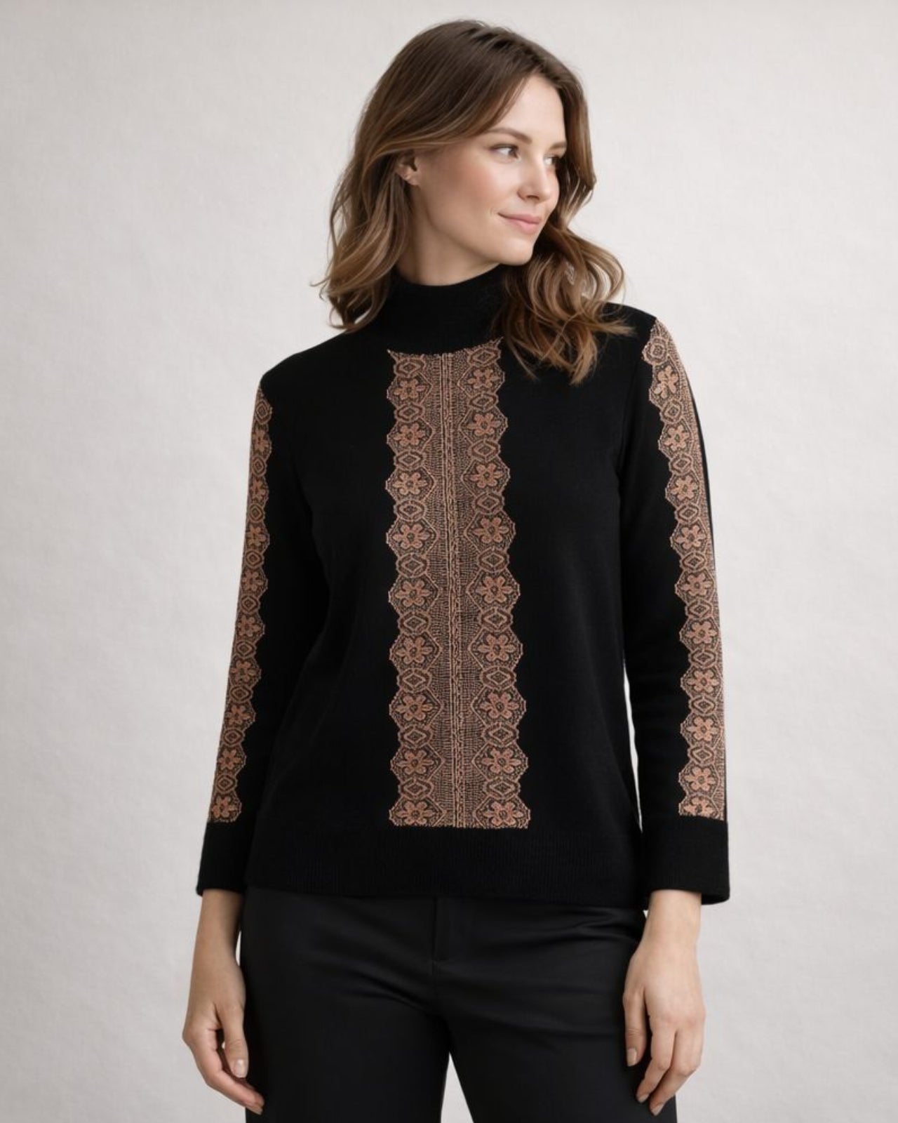 Imagine yourself standing amidst the breathtaking, snow-dusted peaks of Spiti Valley. You are perfectly enveloped in the cozy embrace of this sweater with lace embroidery.