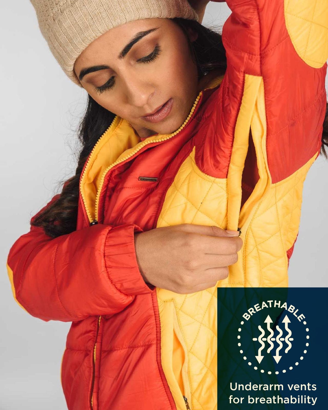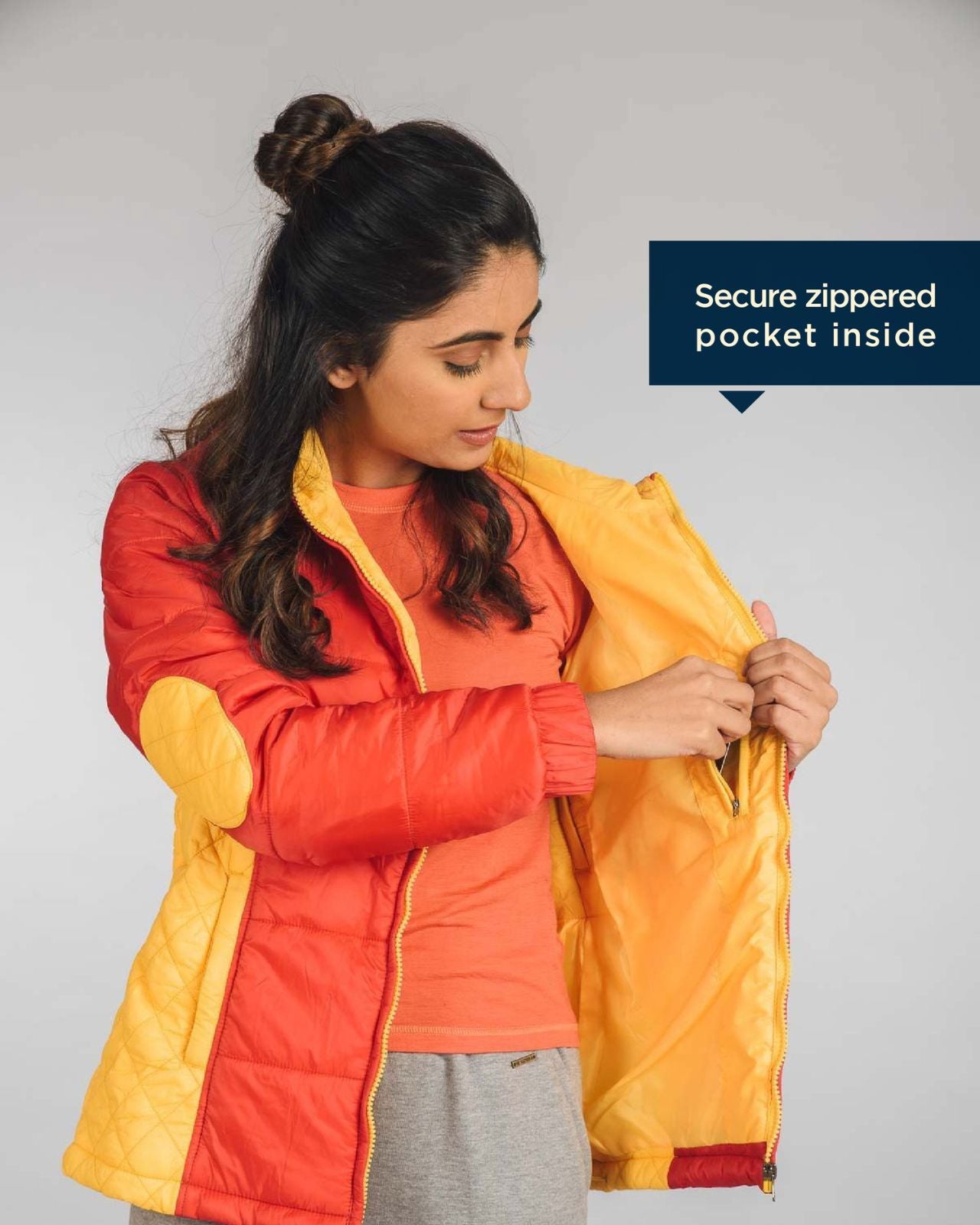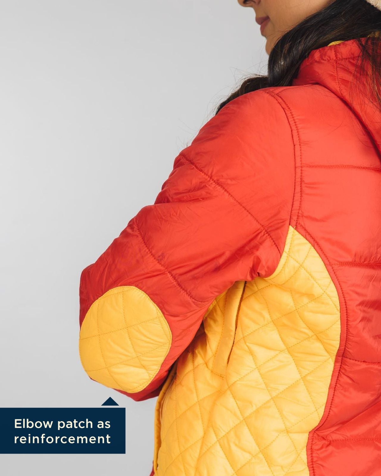 The red and yellow puffer jacket offers warmth and style in a lightweight design.