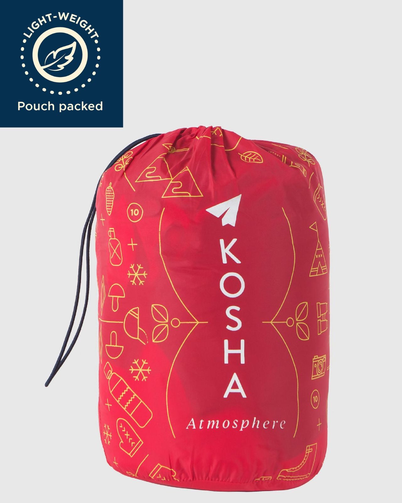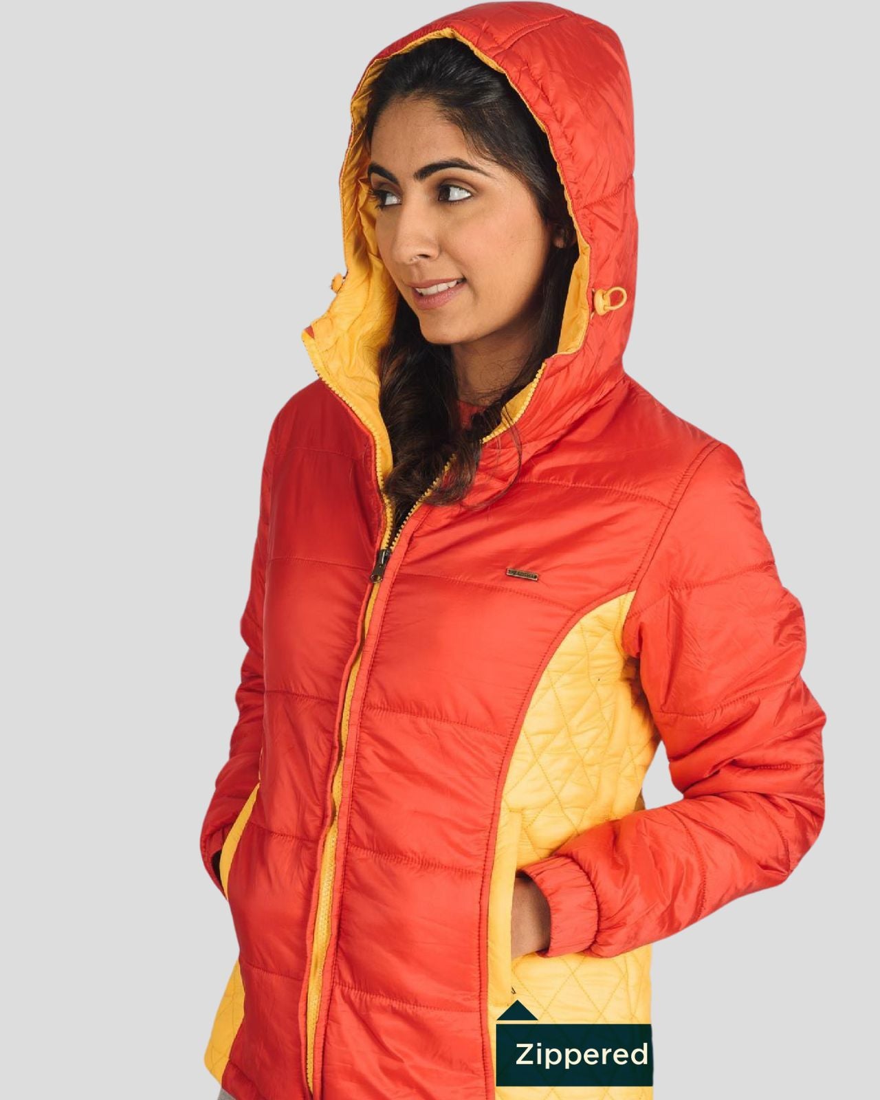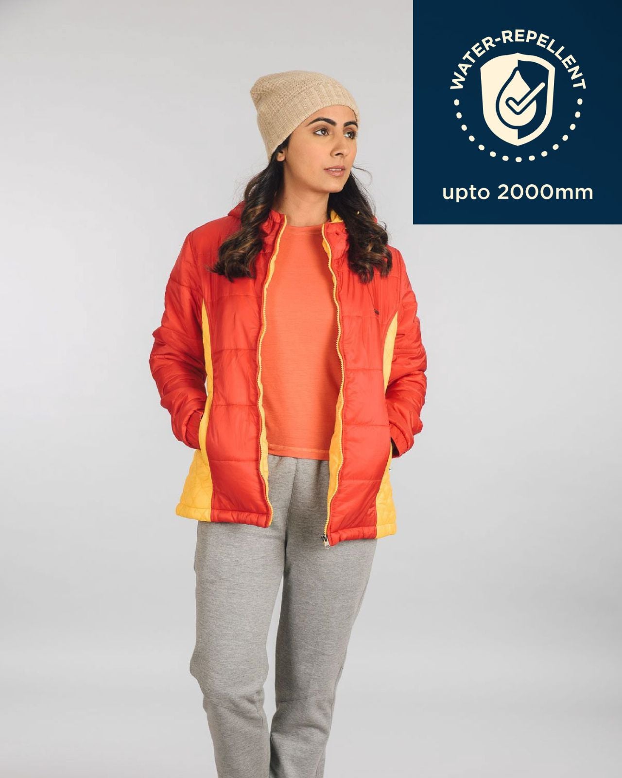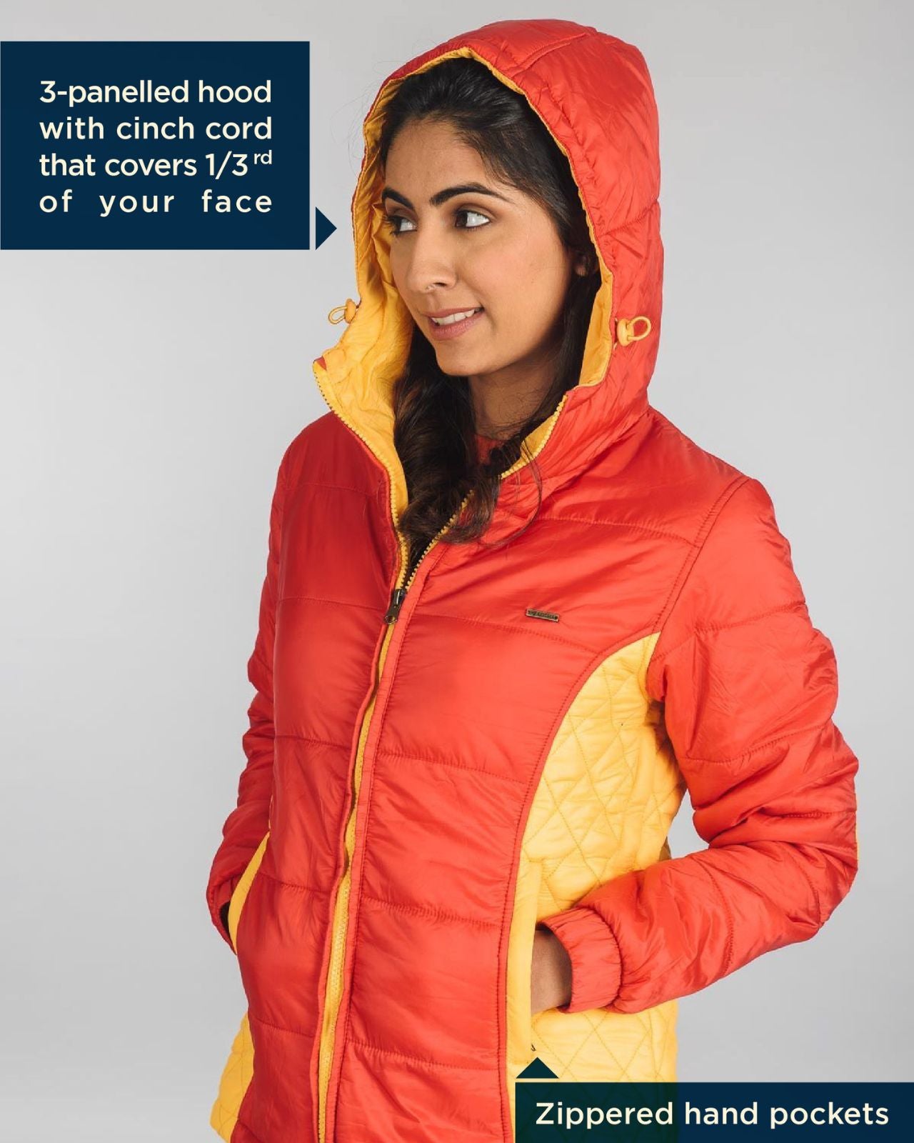 The red and yellow puffer jacket offers warmth and style in a lightweight design.